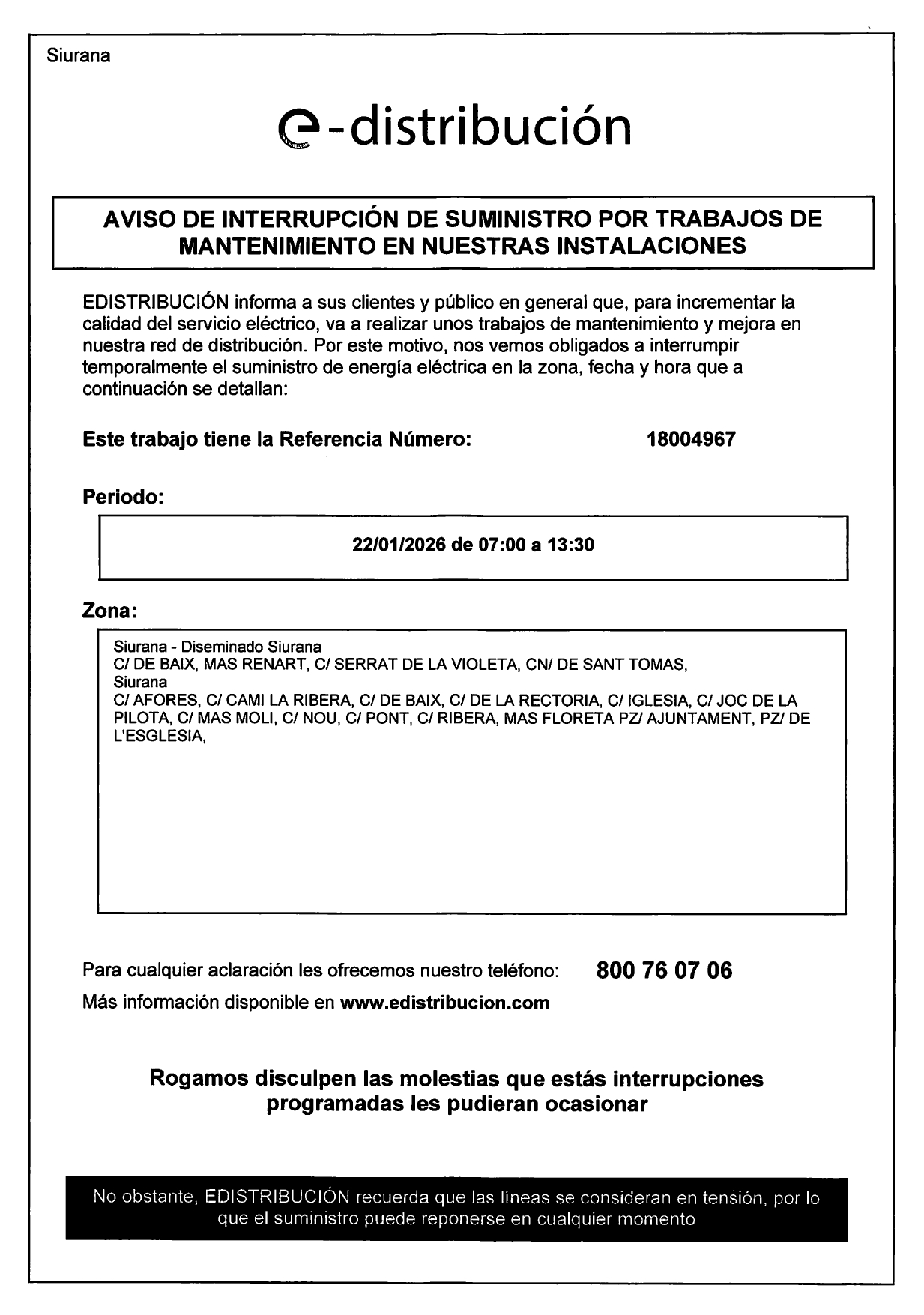 L’empresa e-distribución ens ha comunicat que hi haurà un tall de subministrament d’electricitat per incrementar la qualitat del servei i per treballs de manteniment.