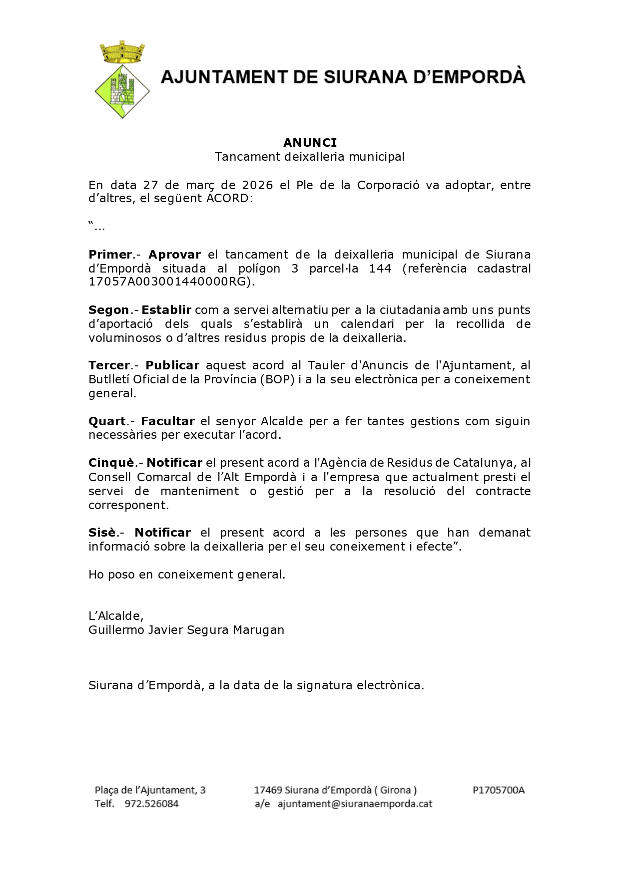TANCAMENT DEIXALLERIA MUNICIPAL